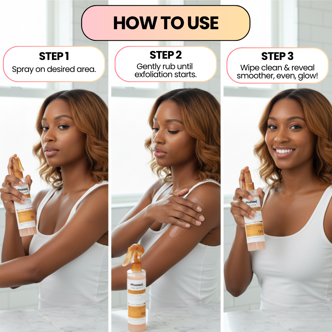 Just spray, gently massage in circular motions until exfoliation appears, then wipe clean. Use 4-5 times per week for visibly smoother, brighter skin in as little as 30 days.